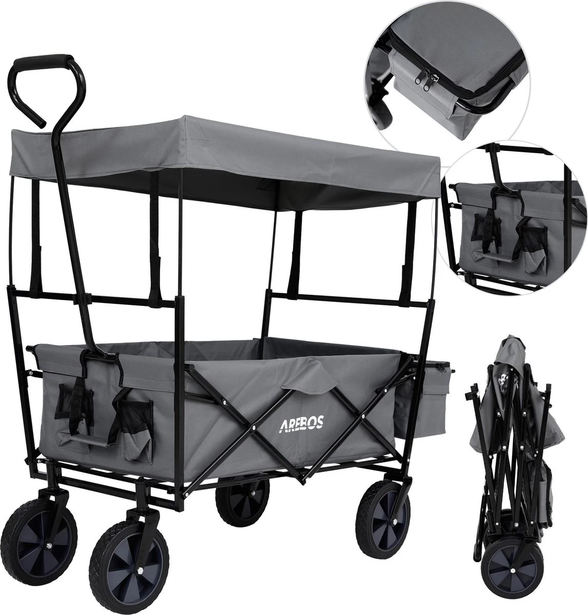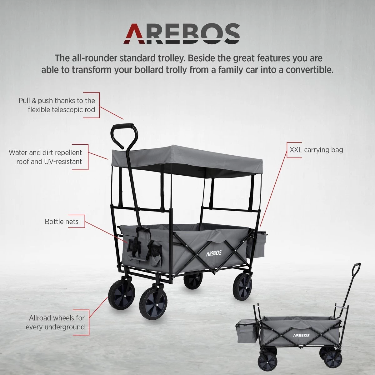 [FUN] De duurzame nylon stof en stevige frameconstructie bieden een maximaal draagvermogen tot 70 kg. De AREBOSBollerwagen biedt dus voldoende ruimte voor uitstapjes met de kinderen, festivals of andere vrijetijdsactiviteiten.