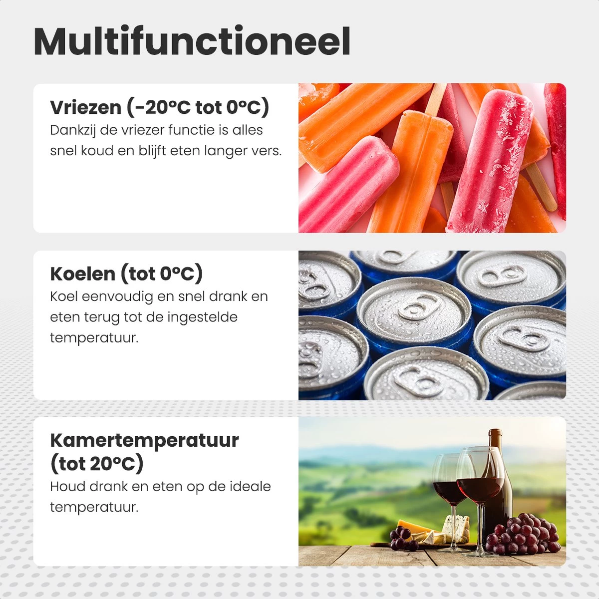 Geniet van een heerlijk dagje weg met deze krachtige Elektrische Compressor Koelbox van Auronic! Dankzij de capaciteit van 30,4 liter kun je maar liefst 36 blikjes koel houden, je hoeft je daarom geen zorgen te maken dat jouw drankjes of snacks gedurende de dag warm worden. Het robuuste en schokbestendige ontwerp zorgt ervoor dat jouw inhoud onderweg altijd veilig is. Het beste van alles is dat de koelbox wordt geleverd met elektrische stekkers die werken op 12/24V en 240V, zodat je er zeker van bent dat je de koelbox altijd van stroom kunt voorzien. Kies uit de vijf standen: Vriezer, Normaal, Koud, Eco en Max!