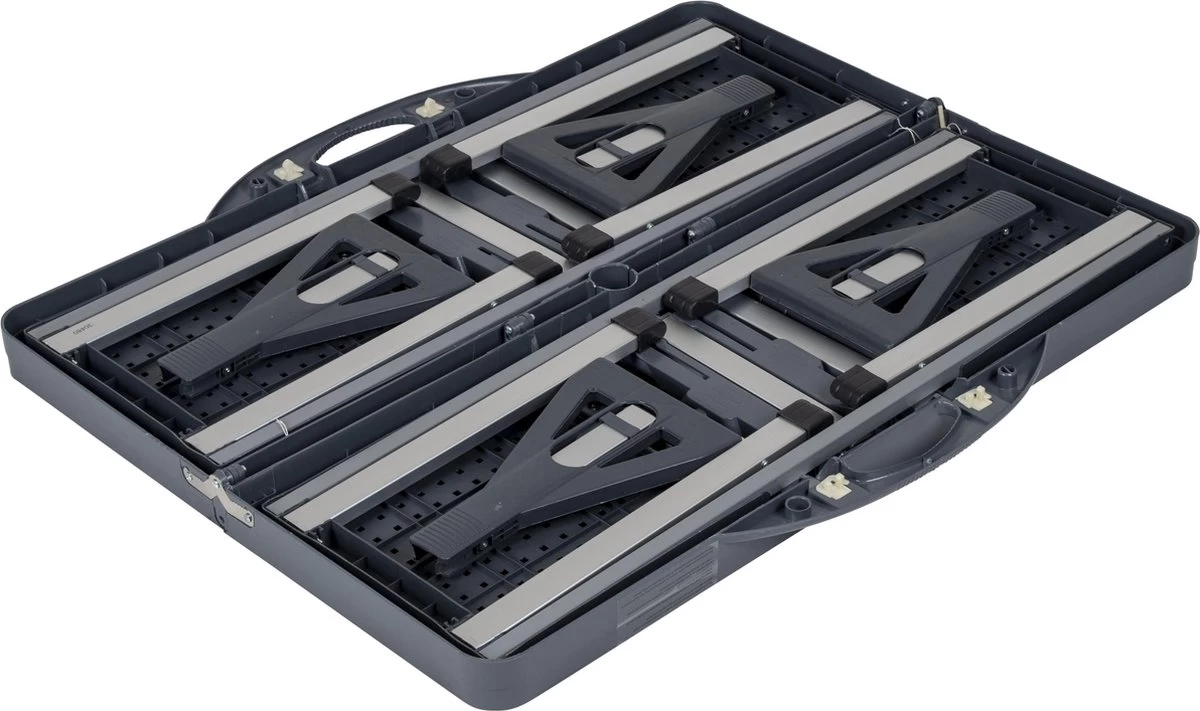 Een stevige picknicktafel met 4 zittingen, een parasolhouder en kofferfunctie. Doordat de picknicktafel inklapbaar is en omgebouwd kan worden tot koffermodel is deze extreem compact en gemakkelijk mee te nemen. De zitplaatsen zitten vast aan de tafel, waardoor losse stoelen overbodig worden. De tafel beschikt over een stevig metalen frame met ABS tafelblad. Tot slot is deze picknicktafel eenvoudig en zeer compact in te klappen (lxbxh: 35,86,11 cm). Ideaal om mee te nemen naar de camping of een picknick, maar kan ook goed gebruikt worden in de tuin of op het balkon.