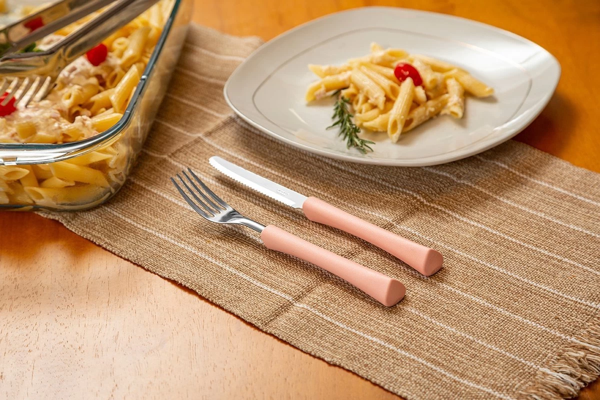 Het roestvrijstalen bestek van de Inova-lijn heeft een thermische behandeling ondergaan die zorgt voor een grotere hardheid, duurzaamheid en een groter snijvermogen en bovendien geen krassen maakt op het porselein. De gekleurde handvatten zijn gemaakt van polypropyleen, wat een hoog kwaliteitsniveau garandeert.