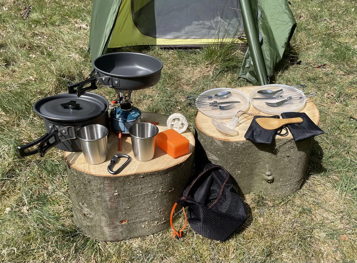 - Inbegrepen: 1 koekenpan, 1 kookpan met deksel, 2 bordjes, 1 opscheplepel/soeplepel, 1 gasbrander, 1 pollepel, 2 lepels, 2 vorken, 2 messen, 2 RVS drinkbekers, 1 afwasspons, 1 clipje, 1 opbergnetje, 1 gasbrander hoes, 2 bestek opbergzakjes.