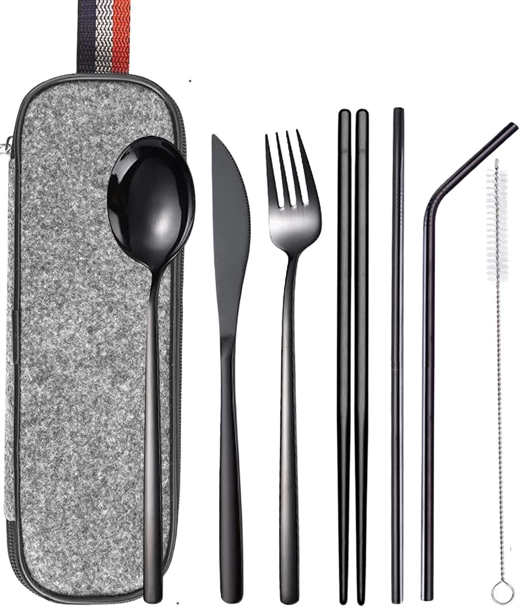 House Of Husk Reisbestek – Reis Bestekset – Chopsticks – Metalen Rietjes Met Borstel – Lepel – Vaatwasserbestendig – RVS – 7 Delig – Zwart